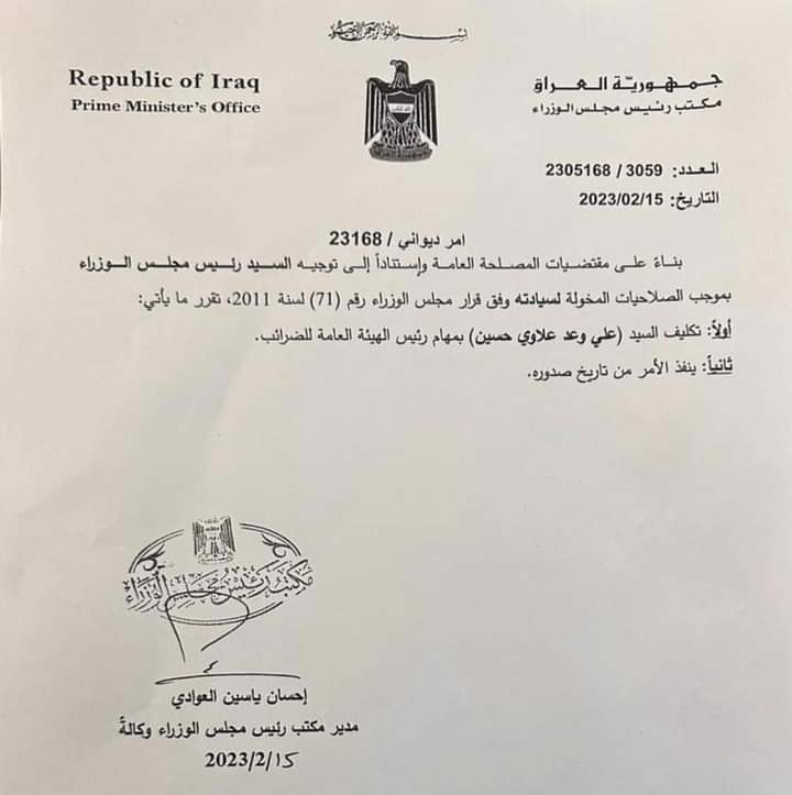 وبحسب وثيقة صادرة عن مكتب رئيس الوزراء حصل المسرى على نسخة منها ، أنه “بناء على مقتضيات المصلحة العامة واستناداً الى توجيه محمد شياع السوداني رئيس مجلس الوزراء تقرر تكليف علي وعد علاوي حسن بمهام رئيس الهيئة العامة للضرائب”.