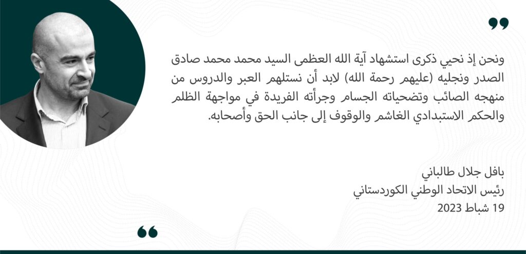 استذكر بافل جلال طالباني رئيس الاتحاد الوطني الكوردستاني، ذكرى استشهاد السيد محمد محمد صادق الصدر، مشيرا إلى استلام الدروس من منهج الصدر الصائب.