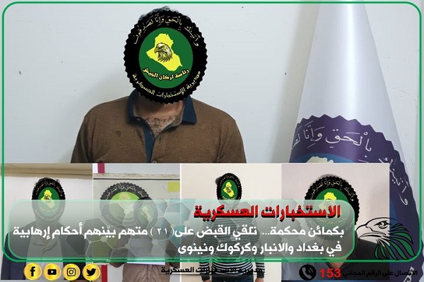 أعلنت مديرية الاستخبارات العسكرية، اليوم الثلاثاء، القبض على21 متهماً في بغداد والأنبار وكركوك ونينوى.