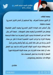 شاركها فيسبوك تويتر لينكدإن بينتيريست البريد الإلكتروني أعلن زعيم التيار الصدري مقتدى الصدر، الجمعة، تجميد التيار الصدري بسبب اهل القضية بدءا من اليوم ولمدة سنة. almasra