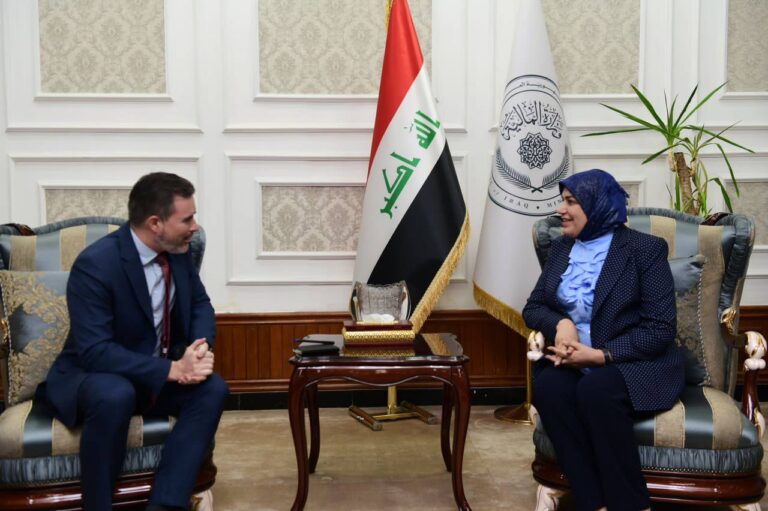 وأضافت أن “اللقاء شهد التباحث في توطيد علاقات العراق الثنائية مع الاتحاد الأوروبي من جهة، وكندا من جهة أخرى، عبر تنمية التعاون المتبادل في مجال المال والإقتصاد والاستثمار”، مؤكدة أن”العراق يتطلع لتعزيز التعاون وعقد شراكات اقتصادية مع المؤسسات والدول الأصدقاء”،لافتة إلى “انفتاح العراق على جميع أشكال التبادل والشراكة التجارية والاقتصادية مع دول الاتحاد الأوروبي وكندا”.