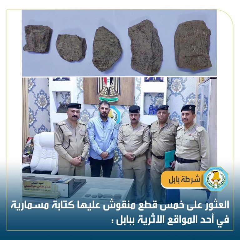 أعلنت قيادة شرطة بابل، اليوم الأربعاء، العثور على خمس قطع أثرية منقوش عليها كتابة مسمارية ضمن أحد المناطق الأثرية بقضاء كوثى “جبلة” شمالي المحافظة.