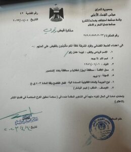 وبحسب وثيقة رسمية صادرة عن المحكمة بتاريخ 4 نيسان الماضي، حصل المسرى على نسخة منها ، فأن “المحكمة أصدرت أمر قبض وتحري بحق كيوما عامل زكو”، مضيفة “أن القاء القبض صدر بتهمة المحتوى الهابط”.