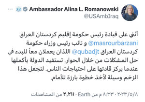 وقالت في تغريدة تابعها المسرى “أثني على قيادة إقليم كردستان (رئيس حكومة الاقليم ونائب رئيس حكومة الاقليم) للعمل معًا للبدء في حل المشكلات من خلال الحوار”.