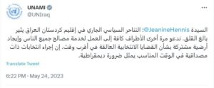 وقالت في تغريدة تابعها المسرى إن “التناحر السياسي الجاري في إقليم كردستان العراق يثير بالغ القلق”، داعية “الأطراف كافة إلى العمل لخدمة مصالح جميع الناس وإيجاد أرضية مشتركة بشأن القضايا الانتخابية العالقة في أقرب وقت”.