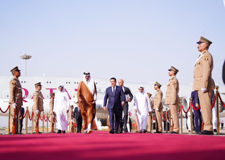 واستقبل”رئيس مجلس الوزراء محمد شياع السوداني أمير دولة قطر، سموّ الشيخ تميم بن حمد آل ثاني، في صالة الشرف الكبرى بمطار بغداد الدولي”. وفقا لبيان من مكتبه الإعلامي.