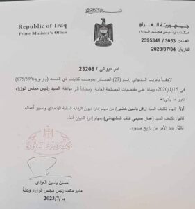 وجاء في وثيقة مذيلة بتوقيع مدير مكتب رئيس الوزراء، إحسان العوادي تابعه المسرى ، أنه “لاحقاً بأمرنا الديواني رقم 27 الصادر بموجب كتابنا بالعدد (م.ر.و/د6/59/675) في 15 كانون الثاني 2020، وبناءً على مقتضيات المصلحة العامة واستناداً إلى موافقة رئيس مجلس الوزراء تقرر ما يأتي: