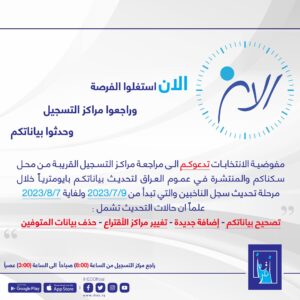 وقالت في بيان خاطبت فيه الناخبين إن “مفوضية الانتخابات تدعوكم إلى مراجعة مراكز التسجيل القريبة من محل سكناكم والمنتشرة في عموم العراق لتحديث بياناتكم بايومتريا خلال مرحلة تحديث سجل الناخبين التي تبدأ من 9-7-2023 ولغاية 7-8-2023″، مبينة أن حالات التحديث تشمل تصحيح البيانات وإضافة جديدة وتغيير مراكز الاقتراع وحذف بيانات المتوفين”.