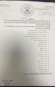 وجاء في /وثيقة / موقعة من وزيرة المالية طيف سامي، صادرة بتاريخ اليوم ، انه “استنادا لاحكام المادة 17 من قانون انضباط موظفي الدولة والقطاع العام رقم 14 لسنة 1991 المعدل وبناء على ما جاء بالتقرير الأولي الخاص باللجنة الفرعية المرقمة 1927 المصادق أصوليا والصلاحيات المخولة لنا، تقرر سحب يد الذوات المدرجة اسمائهم ادناه الموظفين في مصرف الرافدين من الوظيفة لمدة 60 يوما واعتبارا من تاريخه أعلاه”.