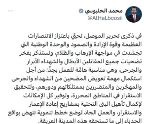 وقال الحلبوسي في تغريدة تابعه المسرى،انه “في ذكرى تحرير الموصل، نحيي باعتزاز الانتصارات العظيمة وقوة الإرادة والصمود والوحدة الوطنية التي تجسدت في مواجهة الإرهاب والظلام، ونستذكر بفخر تضحيات جميع المقاتلين الأبطال والشهداء الأبرار والجرحى”.