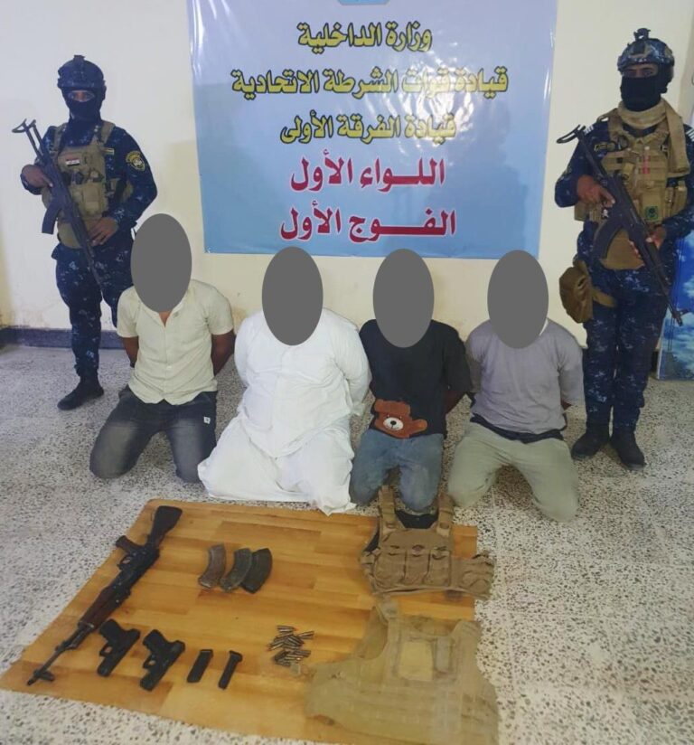 اضاف البيان ” جرت العملية بعد سماع إطلاق عيارات نارية ضمن المنطقة ، وبعد توجه القوة المنفذة للواجب الى المكان المقصود وفرض طوق امني على مداخل ومخارج المنطقة ، أسفر بإلقاء القبض بالجرم المشهود على المتهمين وضبط بحوزتهم بندقية كلاشنكوف ، 4 مخازن بندقية ،مسدسين ، 15 إطلاقة ، مشلح عسكري عدد 2، وتم إحالة المتهمين مع المضبوطات اصولياً الى الجهات المختصة لإكمال الإجراءات القانونية والتحقيقية اللازمة بحقهم.