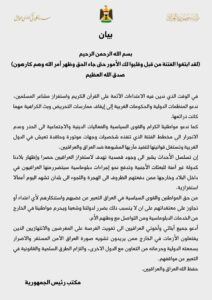 وتابع: “من حق المواطنين والقوى السياسية في العراق التعبير عن غضبهم واستنكارهم لأي اعتداء أو تجاوز على معتقداتهم على ان لا يتسبب ذلك بضرر لدولتنا وشعبنا ويحرم مواطنينا في الخارج من الخدمات الدبلوماسية ومن التواصل مع وطنهم الأم، وأدعو جميع أبنائي وأخوتي العراقيين الى تفويت الفرصة على المغرضين والانتهازيين الذين يفتعلون الأزمات في الخارج ممن يريدون تشويه صورة العراق الآمن المستقر والاضرار بسمعته الدولية وحرمانه من التعاون مع الدول الاخرى، والتزام الطرق السلمية والقانونية في التعبير عن مواقفهم”.