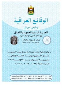 وافادت مدير عام دائرة الوقائع العراقية حنان منذر نصيف في بيان تلقى المسرى نسخة منه ، ان ” العدد تضمن صدور بيان تصحيح صادر عن رئاسة ديوان رئاسة الجمهورية بشأن قانون الموزانة العامة الاتحادية لجمهورية العراق رقم (13) لسنة 2023 للسنوات المالية (2023- 2024 – 2025 )”.