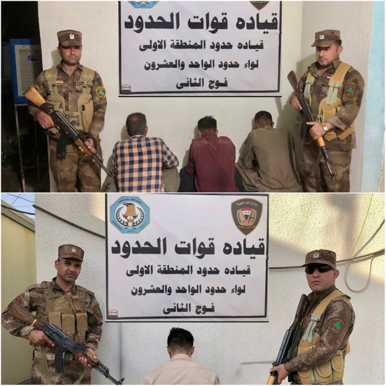 وقالت قيادة قوات الحدود العراقية في بيان إنه “من خلال المتابعة الميدانية المستمرة لمنع حالات التسلل والتهريب، تمكن الفوج الثاني في لواء الحدود الحادي والعشرين ضمن قيادة حدود المنطقة الأولى من إلقاء القبض على (4) متسللين أجانب حاولوا اجتياز الحدود بطريقة غير شرعية”، مشيرة إلى “اتخاذ الإجراءات القانونية اللازمة بحقهم”.