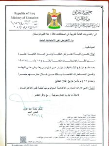 كما وجهت الوزارة “المدارس الإعدادية الى الدوام طيلة فترة الاعتراضات”.