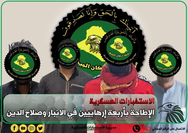 وأضافت أن الكمين “أسفرت عن إلقاء القبض على ( ٤ ) إرهابيين مطلوبين للقضاء وفق أحكام المادة الرابعة من قانون مكافحة الإرهاب في قضاء الفلوجة والرطبة والدور، وقد جرى تسليمهم إلى الجهات المعنية حسب السياقات المعمول بها”.