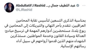 وقال رشيد في تغريدة له تابعه المسرى ،انه “بمناسبة الذكرى التسعين لتأسيس نقابة المحامين العراقيين، نتقدم بأحر التهاني والتبريكات إلى المحامين في ربوع بلدنا”.