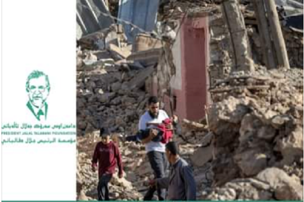 تعرب مؤسسة الرئيس جلال طالباني عن خالص تعازيها وصادق مواساتها لحكومة وشعب المملكة المغربية بضحايا الزلزال الذي ضرب البلاد سائلين المولى عز وجل أن يتغمد ضحايا هذا المصاب الأليم بواسع رحمته ومغفرته وأن يلهم أسرهم الصبر والسلوان وأن يلطف بهم ويديم عليهم السلامة والأمان وأن يمن على المصابين بالشفاء العاجل وعلى المملكة المغربية وشعبها بالأمن والسلام.