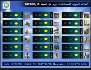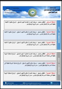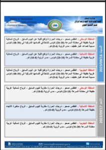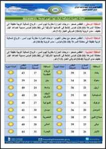 شاركها فيسبوك تويتر لينكدإن بينتيريست البريد الإلكتروني أعلنت هيئة الأنواء الجوية، الجمعة، حالة الطقس في العراق للأيام المقبلة، متوقعة انخفاضا في درجات الحرارة وتصاعدًا للغبار في بعض الأماكن.