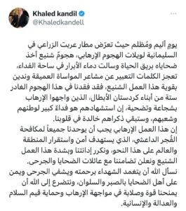 وقال قنديل في تغريدة له على منصة (x ) تويتر سابقا ، يوم أليم ومُظلم حيث تعرّض مطار عربت الزراعي في السليمانية لويلات الهجوم الإرهابي، هجومٌ شنيع أخذ ضحاياه بريق الحياة وسالت دماء الأبرار في ساحة الفداء”.