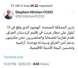 وقال سفير المملكة المتحدة في منشورعلى موقع (X) تويتر سابقاً: ان “المملكة المتحدة تدين الهجوم الذي وقع في 18 أيلول على مطار عربت في إقليم كردستان العراق”.