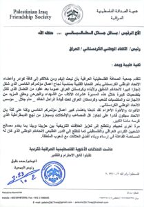 تقدمت جمعية الصداقة الفلسطينية _ العراقية بخالص التهاني وازكى التبريكات الى رئيس الاتحاد الوطني الكردستاني بافل جلال طالباني والى كوادر الحزب ومؤيديه بمناسبة نجاح المؤتمر الخامس للاتحاد الوطني الكردستاني واعادة انتخاب بافل طالباني رئيسا له.