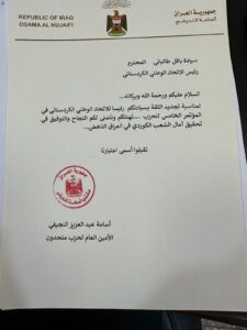 شاركها فيسبوك تويتر لينكدإن بينتيريست البريد الإلكتروني بعث الأمين العام لحزب ( متحدون ) أسامة عبد العزيز النجيفي التهاني لرئيس الاتحاد الوطني الكردستاني بافل جلال طالباني بمناسبة تجديد الثقة له رئيسا للحزب. نص التهنئة .. almasra