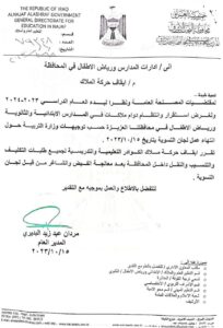 شاركها فيسبوك تويتر لينكدإن بينتيريست البريد الإلكتروني عممت مديرية تربية النجف الاشرف توجيها رسميا ، يقضي بايقاف حركة التنقلات في مؤسساتها التربوية. وأشارت( وثيقة رسمية )، حصل عليها المسرى ، بهذا الشأن الى أن ايقاف حركة التنقلات شمل المدارس ورياض الأطفال حسب توجيهات وزارة التربية. almasra