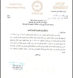 وحصلت المسرى على وثيقة صادرة من البنك المركزي العراقي موجهة إلى المصارف والشركات المجازة ، تضمنت توجيها بإقتناء كاميرا ويب بدقة عالية من اجل إطلاق ميزة الصورة الفورية للزبون وسيتم إطلاق هذه الميزة ابتداءا من يوم السبت الموافق 2023/ 10/ 21، على البيئة الفعلية، راجين الالتزام بتطبيقها عند تسجيل الزبون أو عند اجراء عملية بيع نقدي له، كما نرجو الالتزام بتوخي الدقة عند ادخال بيانات الزبون الى المنصة، وفقا لما هو مطلوب في أي نشاط من انشطتكم لتلافي تعرض مؤسساتكم الى عقوبات قد تصل الى الحرمان من دخول نافذة بيع العملة الأجنبية في حال تكرار ارتكاب الأخطاء والمخالفات ذات الصلة”.