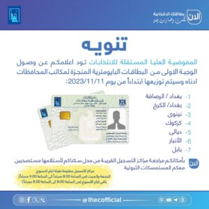 شاركها فيسبوك تويتر لينكدإن بينتيريست البريد الإلكتروني أعلنت المفوضية العليا المستقلة للانتخابات، اليوم الاربعاء، عن وصول الوجبة الاولى من البطاقات البايومترية المنجزة لمكاتب عدد من المحافظات.