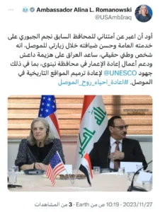 وأكدت رومانوسكي، في تدوينة لها على منصة “إكس”: “أود أن اعبر عن أمتناني للمحافظ السابق نجم الجبوري على خدمته العامة وحسن ضيافته خلال زيارتي للموصل”.
