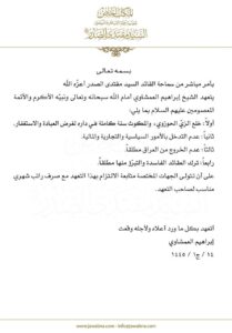 ويأتي الأمر ، في نص بيان صدر من المكتب الخاص للصدر “بسبب تدخل الأخير بالأمور السياسية والمالية والتجارية”.