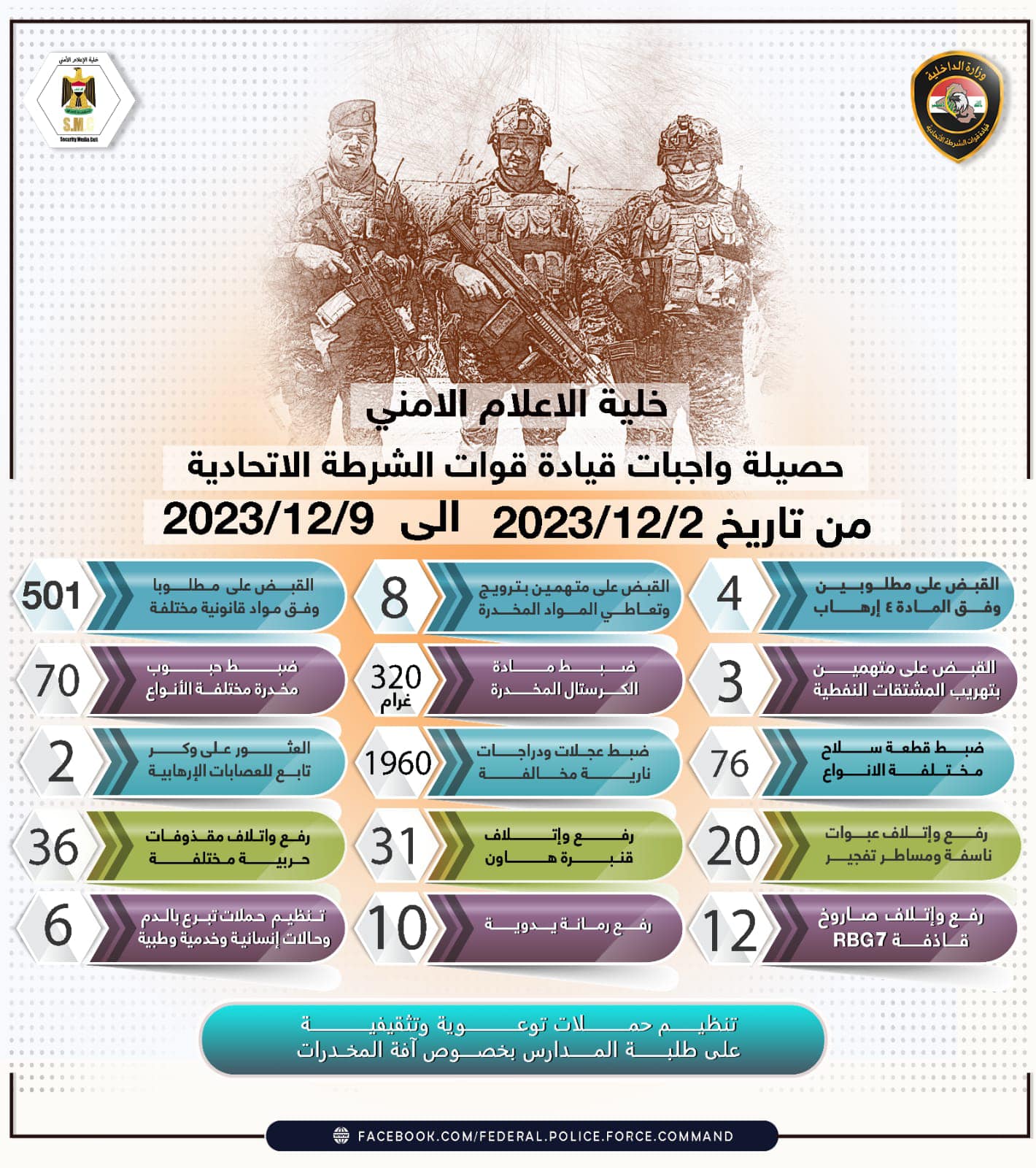 أعلنت قيادة قوات الشرطة الاتحادية العراقية، اليوم الأحد، عن حصيلة واجباتها في وزارة الداخلية للفترة من ( 2 الى 9 / 12 ) 2023 .