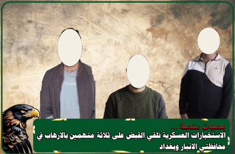 وذكر بيان للمديرية تابعه المسرى، أنه “ضمن جهودها لملاحقة ما تبقى من فلول عناصر عصابات داعش الإرهابية واستناداً إلى معلومات استخبارية دقيقة لشعبتي قيادتي الفرقتين العاشرة والسابعة عشرة التابعتين إلى مديرية الاستخبارات العسكرية وبالتعاون مع استخبارات وقوة اللواءين الأربعين والخامس والخمسين ومن خلال كمائن محكمة نصبتها المفارز، تمكنت من إلقاء القبض على (3) متهمين مطلوبين للقضاء العراقي وفق أحكام المادة (4 / إرهاب) في سيطرتي الصقور والانتصار التابعة إلى قضاء الفلوجة ومنطقة الرضوانية”.