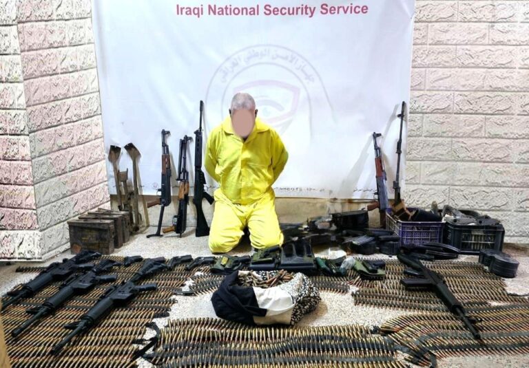 وقال الجهاز في بيان تابعه المسرى، أنه “استناداً لمعلومات استخبارية دقيقة ومتابعة ميدانية، تمكنت مفارز جهاز الأمن الوطني في محافظة المثنى وبعد استحصال الموافقات القضائية اللازمة من إلقاء القبض على متهم يتاجر بالسلاح”.