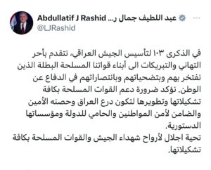 وقال رئيس الجمهورية في منشور على حسابه في موقع X:” في الذكرى ١٠٣ لتأسيس الجيش العراقي، نتقدم بأحر التهاني والتبريكات الى أبناء قواتنا المسلحة البطلة الذين نفتخر بهم وبتضحياتهم وبانتصاراتهم في الدفاع عن الوطن”.