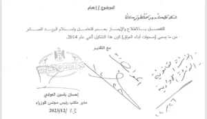 شاركها فيسبوك تويتر لينكدإن بينتيريست البريد الإلكتروني نشر مكتب رئيس مجلس الوزراء، إعماماً تضمن الإيعاز بعدم التعامل واستلام البريد الصادر من ما يسمى (صحوات أبناء العراق). ولفت الإعمام، عبر ” وثيقة ” الى أن تشكيل (صحوات أبناء العراق) قد ألغي منذ العام 2014. almasra