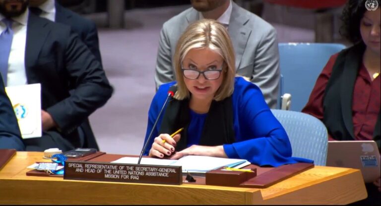 وقالت بلاسخارت خلال إحاطتها التي تقدمت بها إلى مجلس الأمن بشأن آخر التطورات في العراق تابعه المسرى إننا “نرحب بالحوار الأمني بين العراق والولايات المتحدة، وأن إرسال الرسائل من خلال الضربات لا يؤدي إلا إلى تصعيد للتوترات وإلى قتل الناس أو إصابتهم وإلى تدمير الممتلكات”، مبينة أن ” الحكومة العراقية أحرزت تقدما في الاصلاح المصرفي والمالي، وأن المنصة الإلكترونية لتحويل الدولار تضمن الشفافية المالية في العراق، حيث أن الإصلاحات الحكومية ترسم مستقبلا مشرقا للعراقيين ، رغم أن التنافس السياسي مستمر بشأن رئاسة البرلمان “.