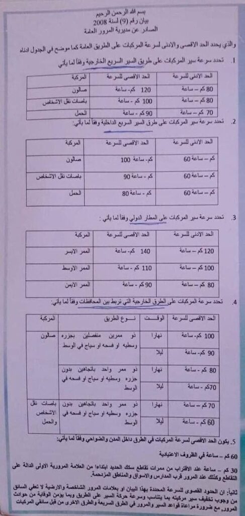 شاركها فيسبوك تويتر لينكدإن بينتيريست البريد الإلكتروني نشرت مديرية المرور العامة، اليوم الجمعة، وثيقة تتضمن ايضاحاً بالجداول حول الحد الأدنى والأقصى لسرعة المركبات في الطرق الداخلية والخارجية بعد دخول قرار تفعيل الكاميرات الذكية في تقاطعات العاصمة بغداد وعدد من الطرق الخارجية، حيز التنفيذ.