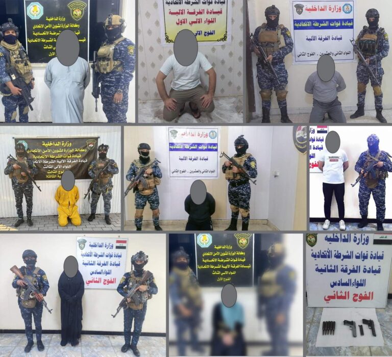 وقالت وزارة الداخلية في بيان إن ” الجهد الأمني لقطعات الفرقة الآلية شرطة اتحادية بإسناد الجهد الاستخباري والقطعات الملحقة، أسفرت عن إلقاء القبض على ( 8 ) متهمين بمواد قانونية تضمنت ( ارهاب ، قتل ، اعتداء ، بناء الاراضي الزراعية ) في مناطق ( حي العامل ، البياع ، حي التراث ، الرضوانية ، الدورة )ك.