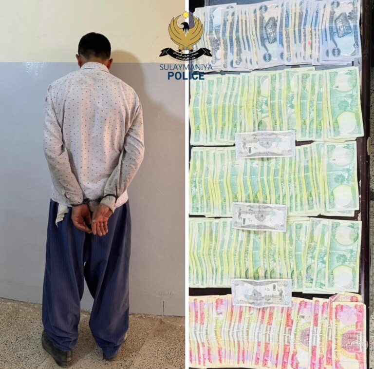 اعتقلت مكافحة إجرام السليمانية، الأحد، متهماً بسرقة 30 مليون دينار و6800 دولار داخل منزل في إحدى مناطق السليمانية.