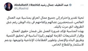 وقال الرئيس رشيد في تغريدة له ” تحية تقدير واحترام إلى جميع عمال العراق بمناسبة عيد العمال العالمي، مُستحضرين نضالهم وكفاحهم في بناء الوطن رغم شتى الظروف التي مرت بالبلد”.