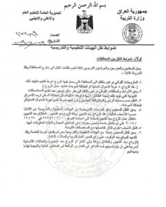 وقالت الوزارة في بيان تابعه المسرى ، ان “المديرية العامة للتعليم العام والأهلي والاجنبي، أصدرت ضوابط نقل الهيئات التعليمية والتدريسية الى خارج المحافظة للعام الدراسي 2024- 2025”.