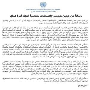 رسالة من بلاسخارت بمناسبة انتهاء فترة عملها