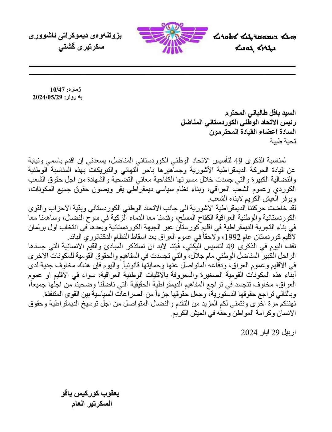 شاركها فيسبوك تويتر لينكدإن بينتيريست البريد الإلكتروني تسلم الاتحاد الوطني الكوردستاني، اليوم الجمعة، برقية تهنئة من الحركة الديمقراطية الاشورية بمناسبة الذكرى الـ 49 لتأسيس الاتحاد، اليكم نص البرقية :