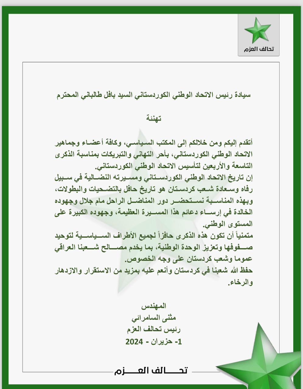 السامرائي يهنئ بتأسيس الاتحاد الوطني: نستحضر جهود الرئيس طالباني الكبيرة