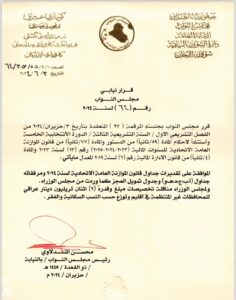 وجاء في نص القرار النيابي ، “قرر مجلس النواب بجلسته المرقمة ( ٢٧ ) المنعقدة بتأريخ ٣ حزيران ٢٠٢٤ واستنادًا إلى احكام المادة (59) ثانيًا من الدستور، وإلى احكام المادة (77) ثانيًا من قانون الموازنة العامة للسنوات المالية (2023، 2024، 2025) رقم (13) لسنة 2023، واحكام المادة (4) ثانيًا من قانون الادارة المالية رقم (6) لسنة 2019 المعدل ما يأتي :