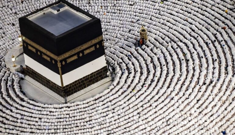 وتبدأ حشود المؤمنين بالطواف حول الكعبة، قبلة المسلمين في صلاتهم، بأثواب الإحرام البيضاء.