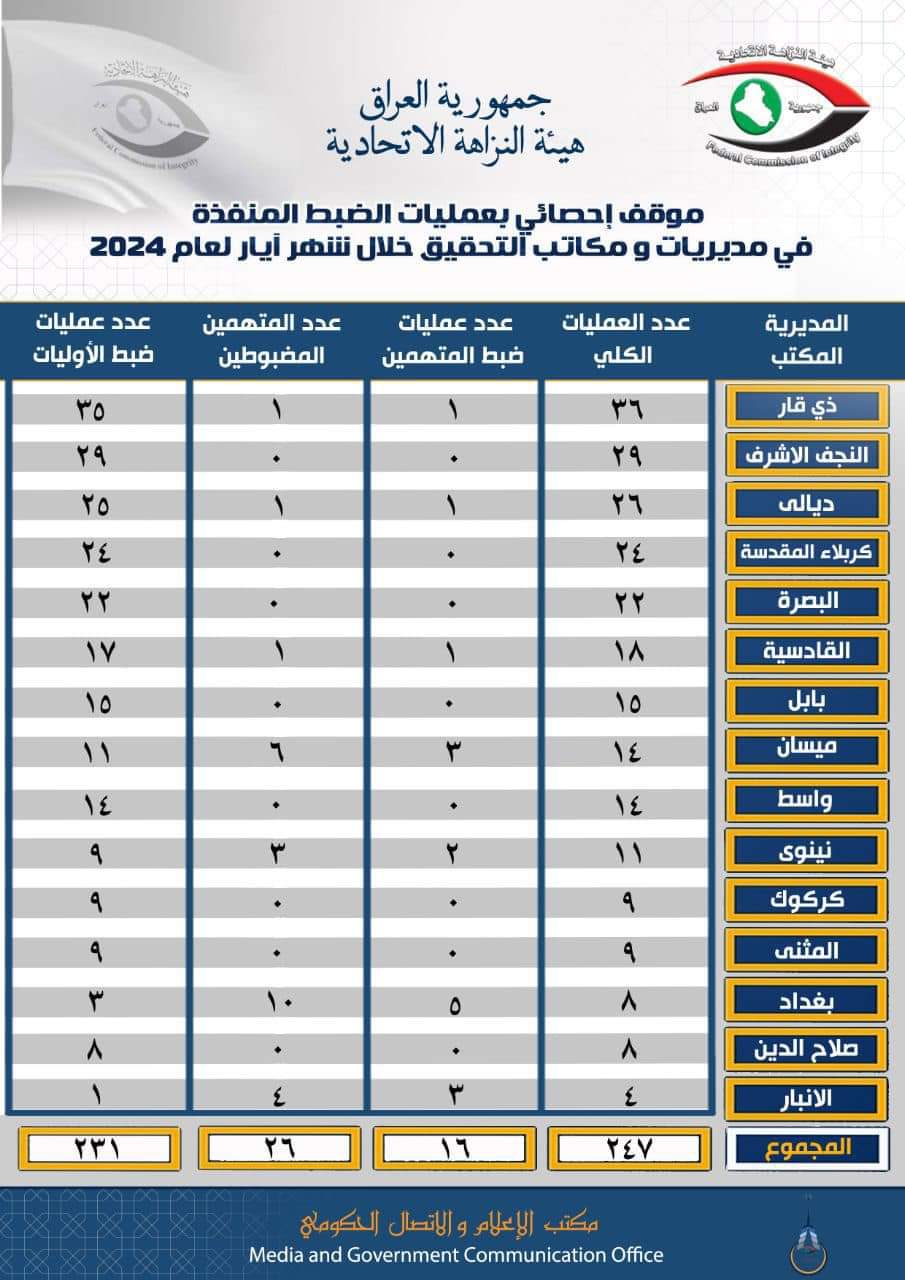 أصدرت هيئة النزاهة، اليوم الجمعة، إحصائية بعمليات الضبط المنفذة في مديرياتها ومكاتبها خلال شهر أيار الماضي.