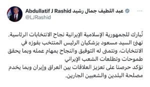 وهنا في الوقت ذاته مسعود بزشكيان الرئيس المنتخب بفوزه في الانتخابات، متمنيا له التوفيق والنجاح بمهام عمله وبما يحقق طموحات وتطلعات الشعب الإيراني.